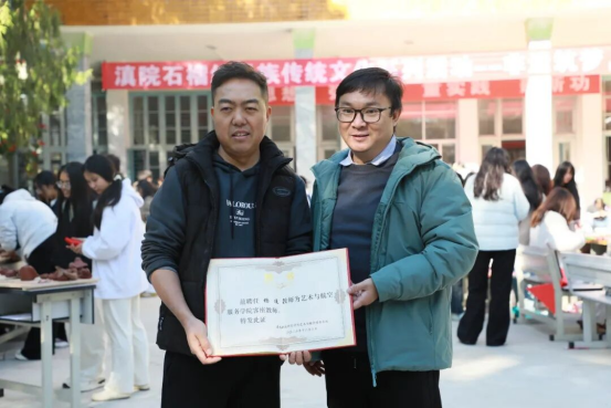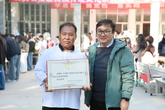艺术与航空服务学院副院长肖波为活动致辞,他表示,非遗是民族文化的根脉,学院以此次活动为契机搭建交流平台,旨在让青年学子近距离触摸非遗、感受非遗,让青春力量成为非遗传承与创新的重要支撑。致辞后,肖波副院长为杨追、王国明两位传承人颁发聘书,聘请二位担任学院客座教师,为非遗融入课堂教学、实践育人筑牢根基。