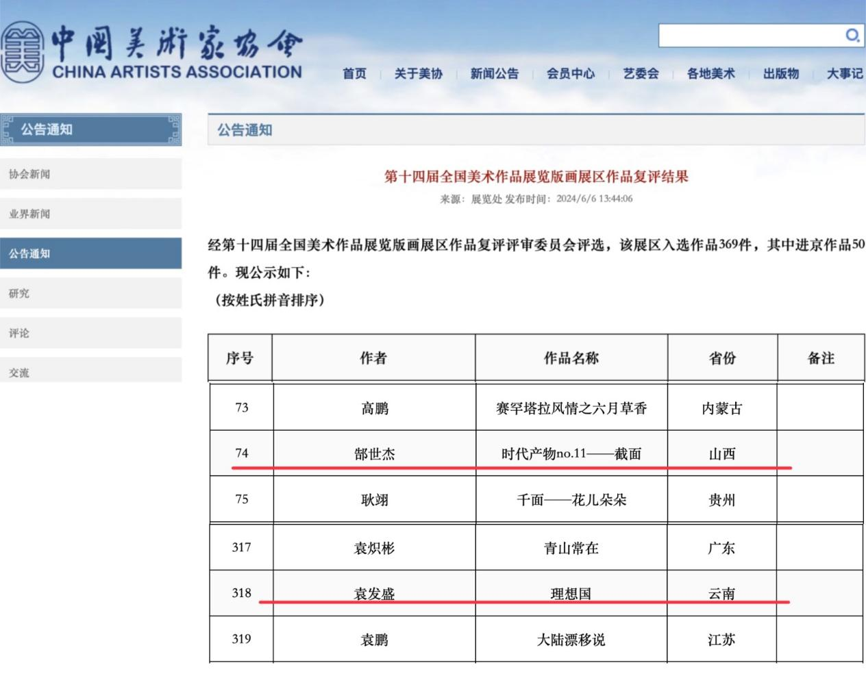 6月6日,中国美术家协会官方网站公布了“第十四届全国美术作品展览版画展区复评结果”,我校艺术学院教师郜世杰的作品《时代产物no.11-截面》和21级美术学班学生袁发盛的作品《理想国》在众多作品中脱颖而出,荣获入选殊荣。