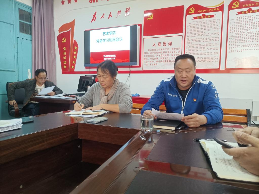 4月14日上午,艺术学院召开党史学习教育动员大会,深入学习贯彻习近平总书记在党史学习教育动员大会上的重要讲话精神,贯彻落实中央、省委和省委教育工委及学校党委工作部署,对艺术学院党史学习教育工作进行安排部署。学院党总支书记王玉七作动员讲话,院长张雁梅主持会议。全院教师参加了会议。