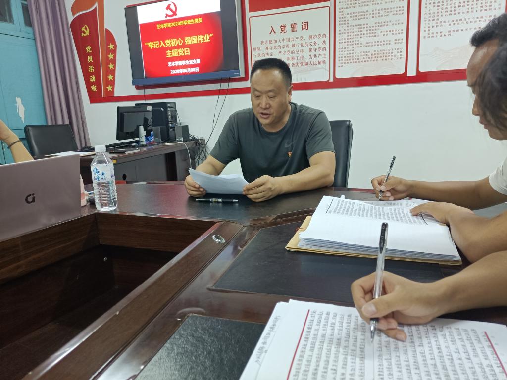 在中国共产党即将迎来建党99周年之际,在2020届毕业生即将离开母校、踏上人生新的征程之时,6月8日晚,2020届毕业生党员“牢记入党初心,投身强国伟业”主题党日活动在党员活动室进行。学院党总支书记、党总支委员、学生党支部全体党员同志以及毕业生党员参加了主题党日活动。活动由艺术学院党总支书记王玉七主持。