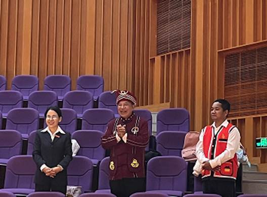 胡德学老支书首先参观了艺术学院的实训室,与师生进行了深入的交流。他向学生们传达了习近平总书记给十位老支书回信的核心精神,并强调了艺术教育在人才培养中的重要作用,他鼓励学生们珍惜现在的学习时光,为社会的进步和发展贡献自己的力量。随后在无麦音乐厅,胡德学老支书和学生们进行了近距离的交谈,胡德学老支书提到“以后是青年的时代,我对大家充满信心!”同学们齐唱佤族歌曲《加林赛》以对老支书的到来表示热烈欢迎!