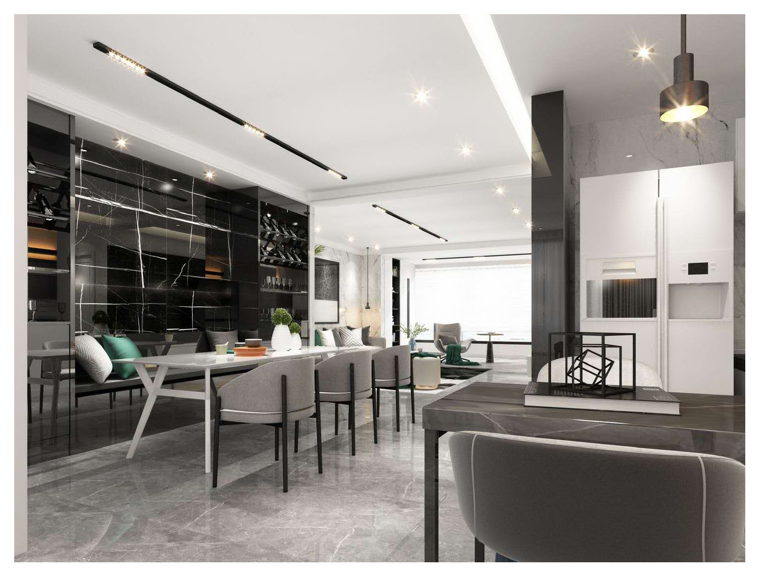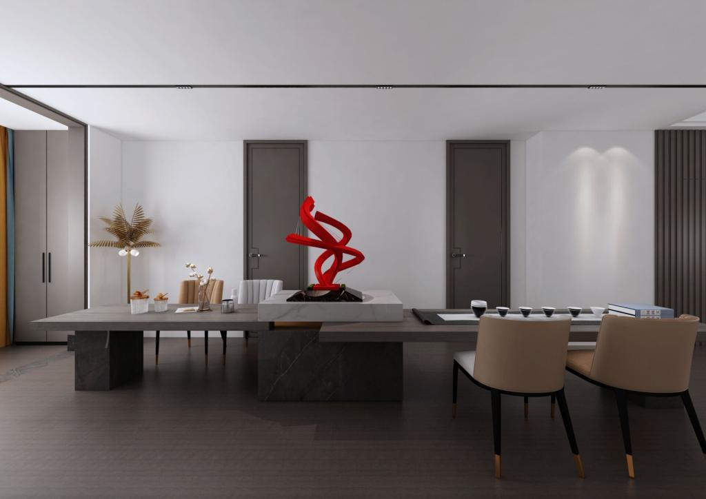 现代简约风格营造简单大气的氛围,其最强调的是设计的功能性和实用性。餐厅是本案的设计亮点,运用石材做部分台面,以及搭配点缀红色装饰摆件,使空间大气感上升,给你一种简约而不简单的视感。
