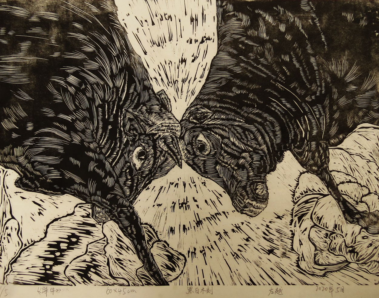 毕业作品:黑白木刻组画3幅《斗牛》、《斗羊》、《祭火台》