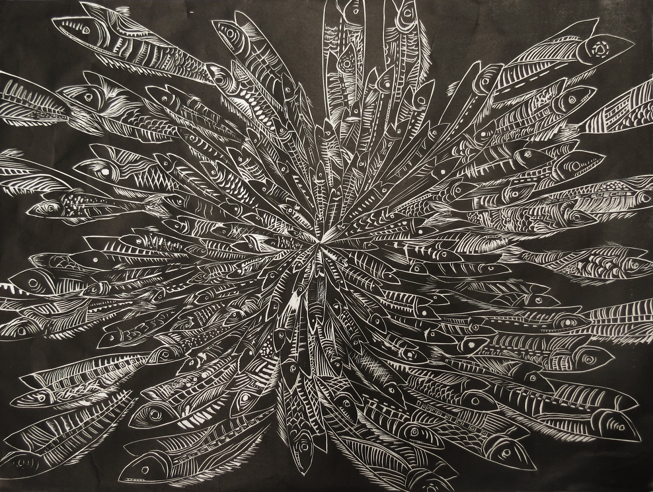 《亡》系列作品简介:用黑白木刻呈现鱼被捕后的景象为主题。《亡》一通过大鱼和小鱼的组合,从俯视的角度进行构图,由中间向四周、由虚到实展现黑白的同学组织关系;《亡》二以许多的小鱼组合在一起,密密麻麻,层层叠叠的堆积形态进行构图,虚实的黑白关系来衬托主题。