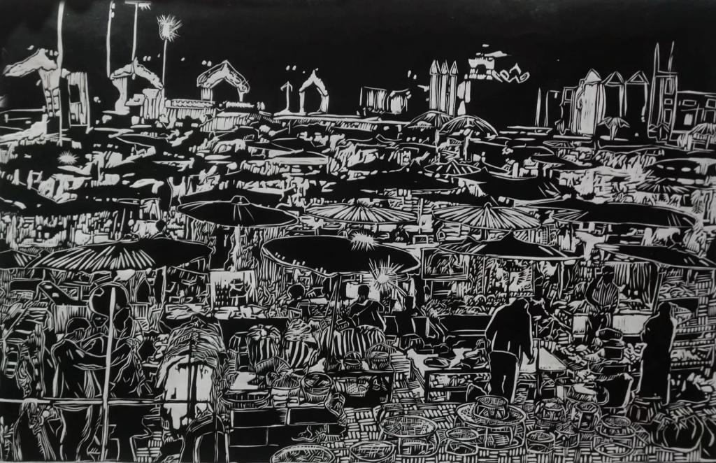 这幅作品的场景是画者在西双版纳最值得去的地方--告庄旅游时记录的。以西双版纳赶摆场为主题,取景于最繁忙的景象。知夜市有很多的特色小吃、东南亚的小物件,入夜以后,夜市灿烂的灯光让人流连忘返。作品记录这个时刻,把记忆存留在作品里,以版画的形式让更多的人了解认识这个地方。