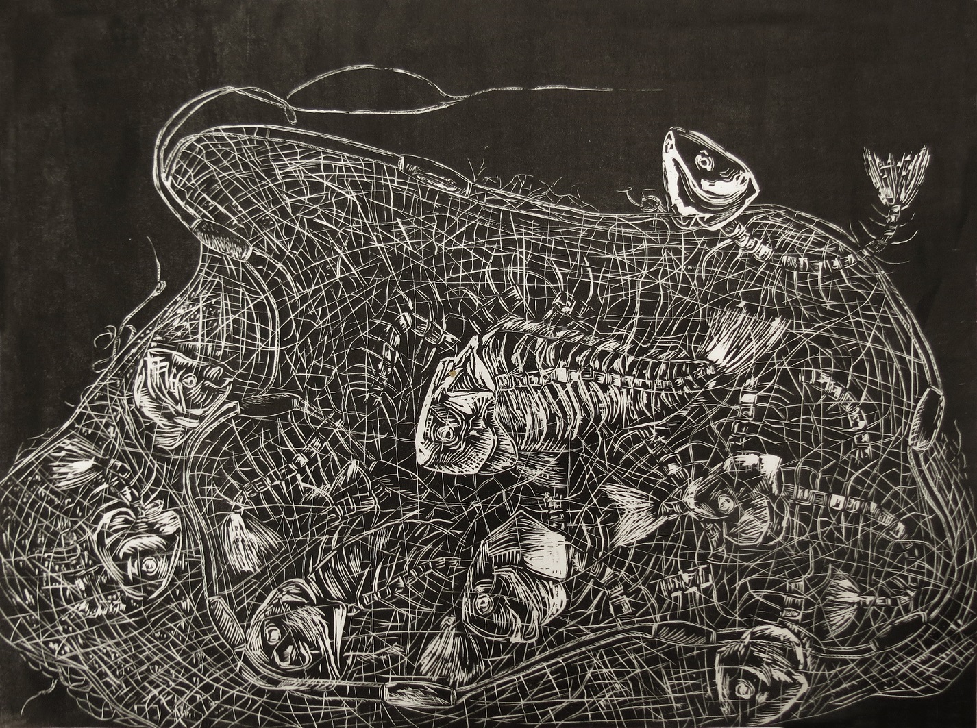 《网》作品简介:鱼被网住死掉的景象为主题,通过对鱼死了以后鱼骨的深入刻画来托出主题。