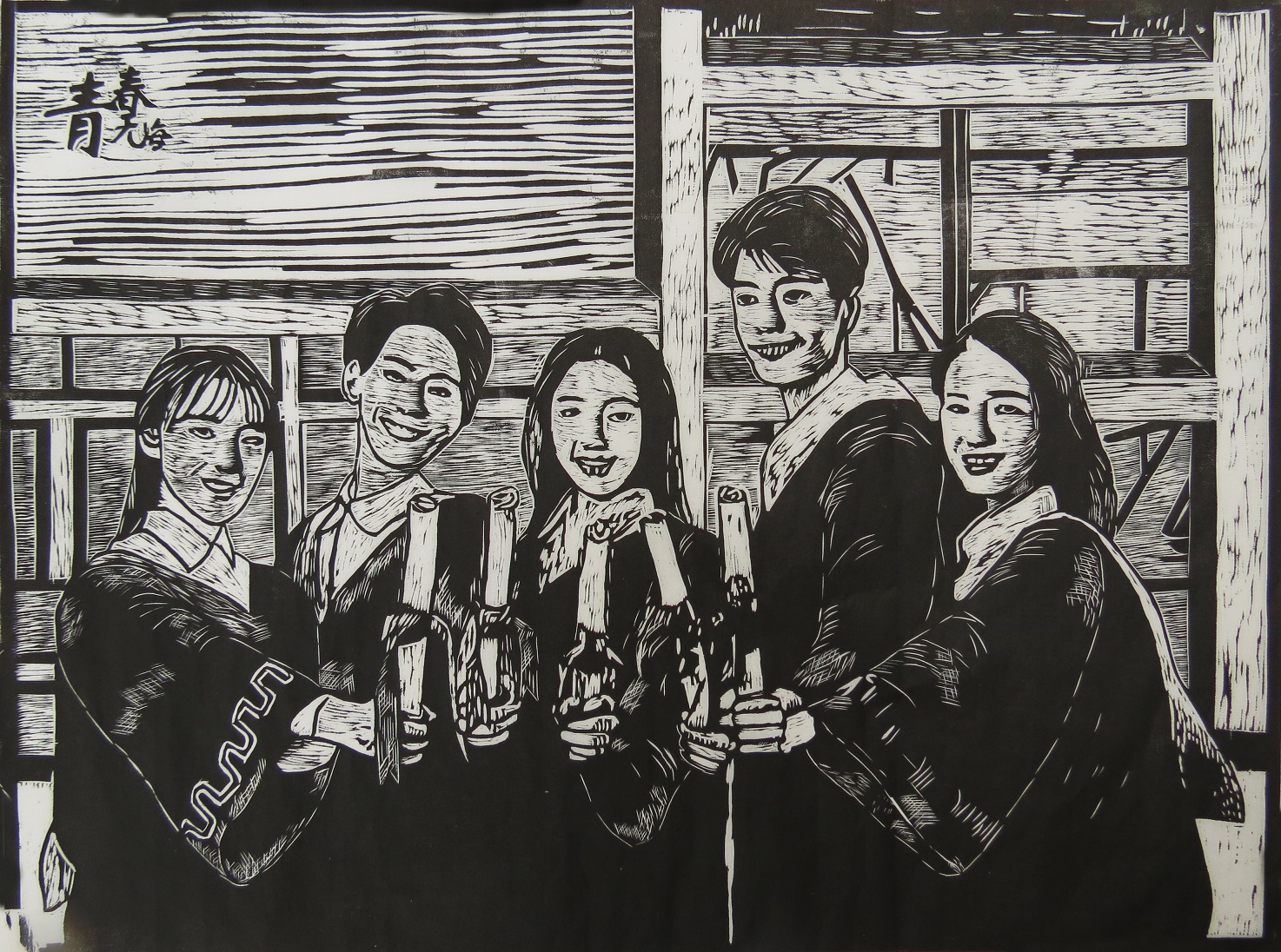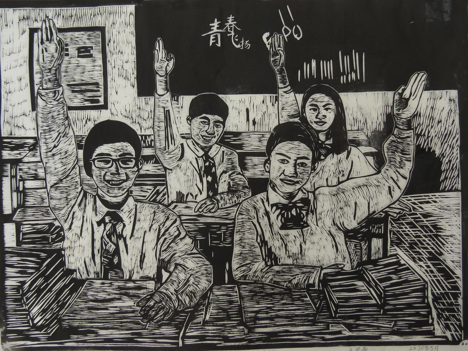毕业作品:黑白木刻组画3幅《青春年少》、《青春飞扬》、《青春无悔》
