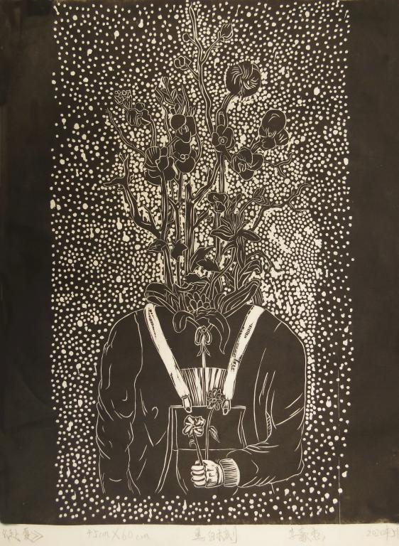 创作构思:以花和人的结合为主题,花在版画中的呈现形式除了外部的形体之美,也具有动态生命变化,在设计花的构图中要注重把握花的形体结构,包括花瓣、花蕊、树枝的大小变化。在人的结构中注重把握好人体肩膀到腰的结构、骨骼、各关节及肢体大小。