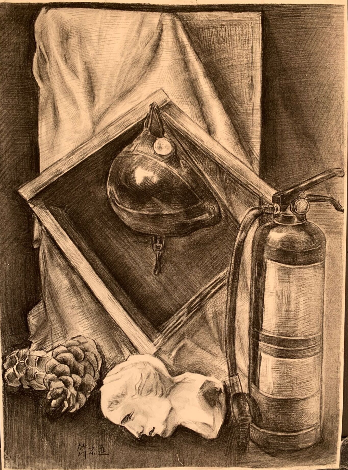 素描是美术专业学生的基本功,素描练习中对造型与透视的把握,黑白灰关系的处理,细节能力的观察与描述,以及在画面整体与局部关系中的对比都是美术专业学生在专业学习中一直要练习的基础。2019级美术教育班的素描课在李俊红、字艳芬两位老师的指导下,用素描静物与石膏头像的习作展示自己在第一学期中的学习成果,是对自己在大学学习中的第一次总结,也是对后续学习的一次激励,希望19级美术教育班能够在本专业的学习中继续保持积极的学习兴趣,保持良好的学习状态,不断发掘自己的潜力,成长为更好的自己。
